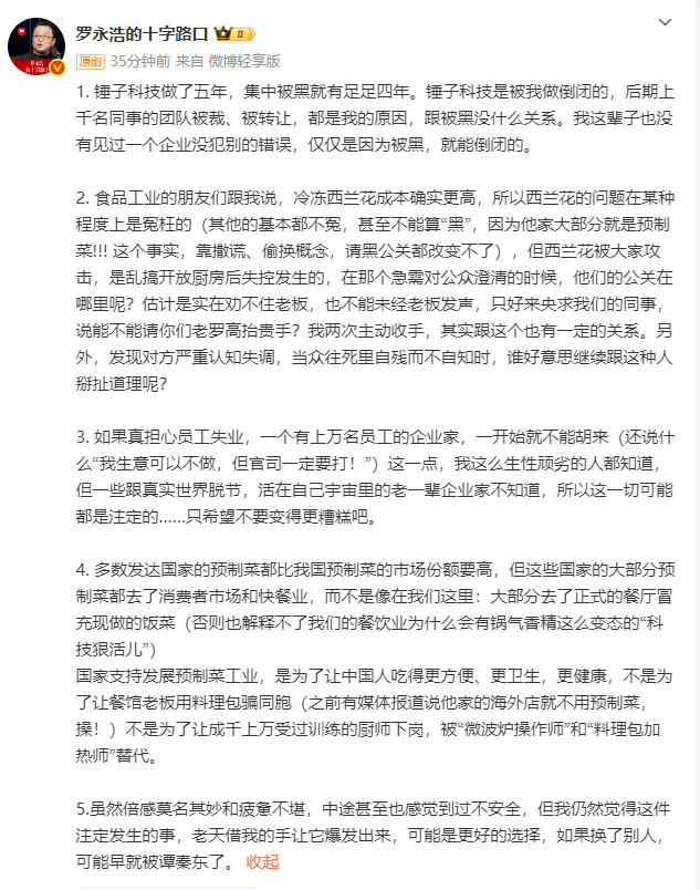 1月16日,@罗永浩的十字路口 再次发长文回应西贝贾国龙近日的言论。他表示,锤子科技做了五年,集中被黑就有足足四年。锤子科技是被我做倒闭的,后期上千名同事的团队被裁、被转让,都是我的原因,跟被黑没什么关系。我这辈子也没有见过一个企业没犯别的错误,仅仅是因为被黑,就能倒闭的。