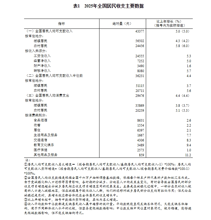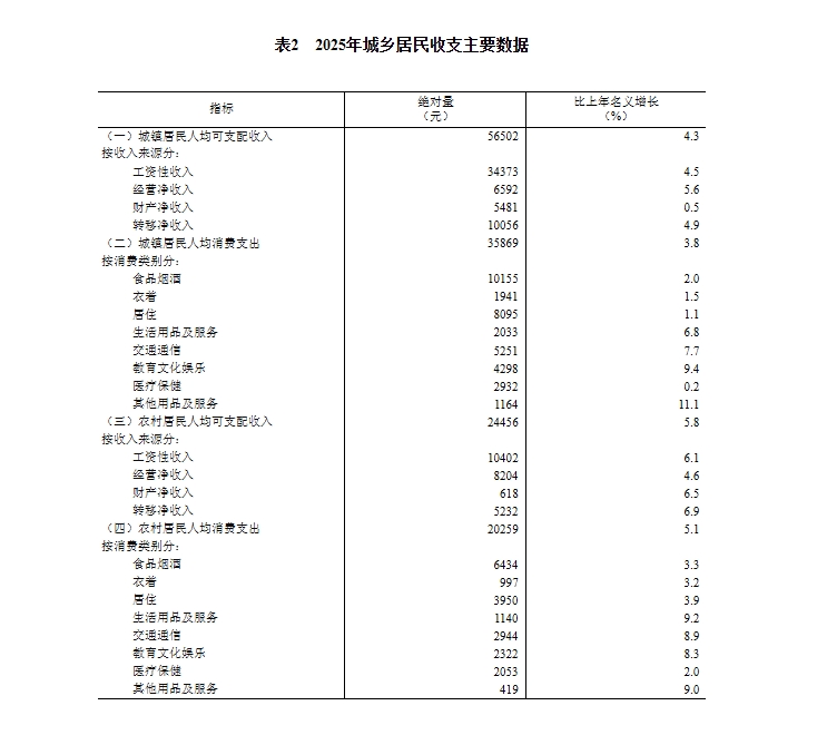2025年,全国居民人均可支配收入43377元,比上年名义增长5.0%,扣除价格因素,实际增长5.0%。分城乡看,城镇居民人均可支配收入56502元,增长(以下如无特别说明,均为同比名义增长)4.3%,扣除价格因素,实际增长4.2%;农村居民人均可支配收入24456元,增长5.8%,扣除价格因素,实际增长6.0%。