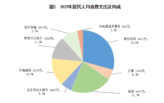 2025年,全国居民人均食品烟酒消费支出8631元,增长2.6%,占人均消费支出的比重为29.3%;人均衣着消费支出1554元,增长2.2%,占人均消费支出的比重为5.3%;人均居住消费支出6397元,增长2.1%,占人均消费支出的比重为21.7%;人均生活用品及服务消费支出1667元,增长7.7%,占人均消费支出的比重为5.7%;人均交通通信消费支出4306元,增长8.3%,占人均消费支出的比重为14.6%;人均教育文化娱乐消费支出3489元,增长9.4%,占人均消费支出的比重为11.8%;人均医疗保健消费支出2573元,增长1.0%,占人均消费支出的比重为8.7%;人均其他用品及服务消费支出859元,增长11.2%,占人均消费支出的比重为2.9%。