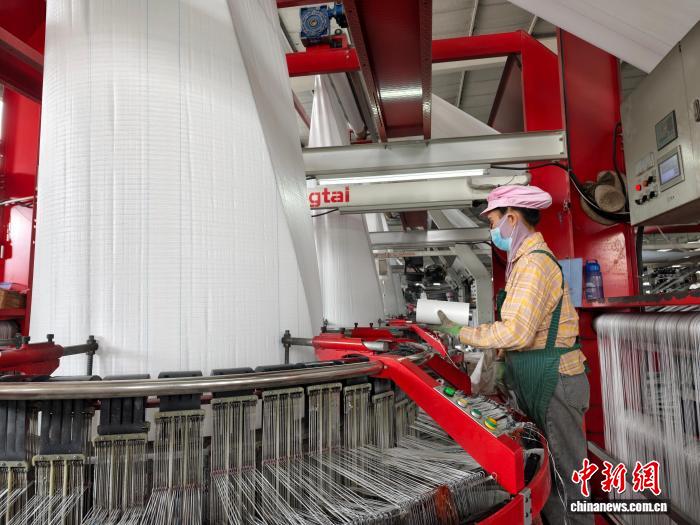 1月13日,儋州伟达化工有限公司生产车间内,工人正利用上游企业生产的聚乙烯开展再加工,制作集装吨袋。 中新社记者 王子谦 摄