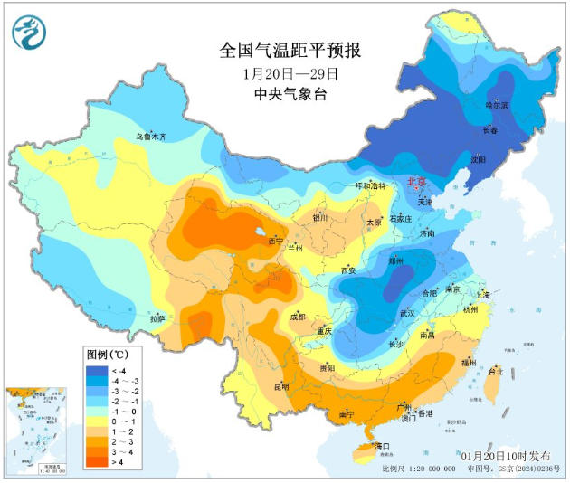 1月20—29日全国气温距平预报。图片来源:中央气象台