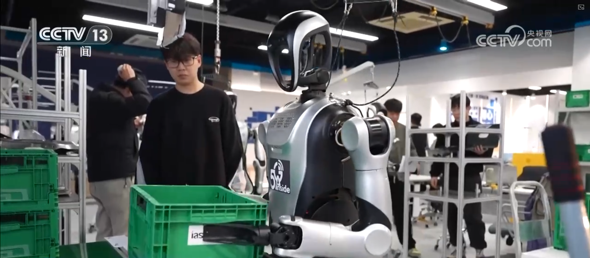 这支年轻的科研团队不仅追求高效,还通过数字孪生技术将各环节实现可视化管理。分拣线上的机械臂可以说是“单一场景”下的“单兵作战”,记者在一家具身智能机器人企业,看到的则是“多元环境”中的“编队练兵”。这个“它”身高1.6米,工作人员正在训练这双“灵巧手”精准抓取不同规格的快递包裹,实现丰富场景下的柔性适配。有了海量训练数据,这些机器人已具备分拣、巡检、搬运等作业能力,量产机型亟待投入实际物流“战场”。