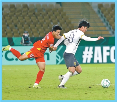 U23男足亚洲杯半决赛,中国队球员王博豪(右)在比赛中拼抢。新华社记者 王海洲摄
