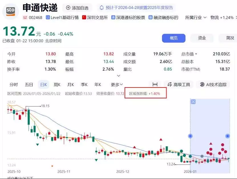 与财务数据的稳步向好相比,申通快递近期股价及市值表现则呈现小幅波动态势。公开交易数据显示,截至2026年1月22日收盘,公司股价13.72元/股,对应总市值210.03亿元;2025年12月31日,公司收盘价为13.42元/股,市值205.43亿元。从2026年年初至今,公司股价区间涨幅1.4%。