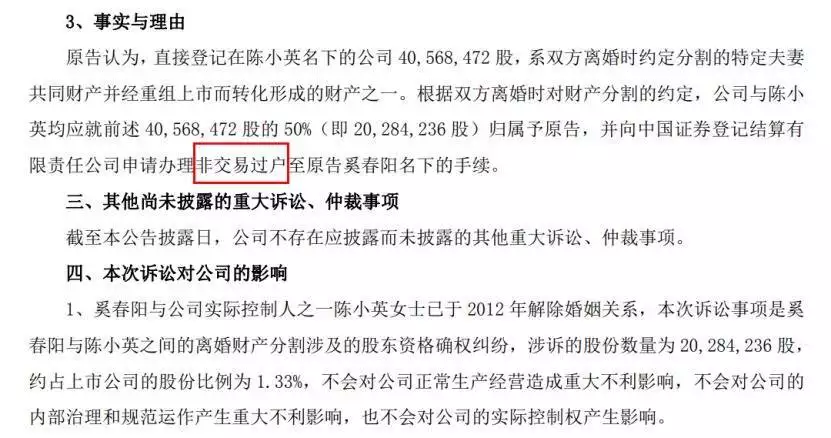 公告披露显示,公司实际控制人之一、创始人陈小英离婚13年后,被前夫奚春阳以股东资格确认纠纷为由告上法庭,索要其名下4056.85万股申通股份(市值约2.8亿元)。这场跨时长、涉金额不小的纠纷,成为当晚财经领域的热议焦点。