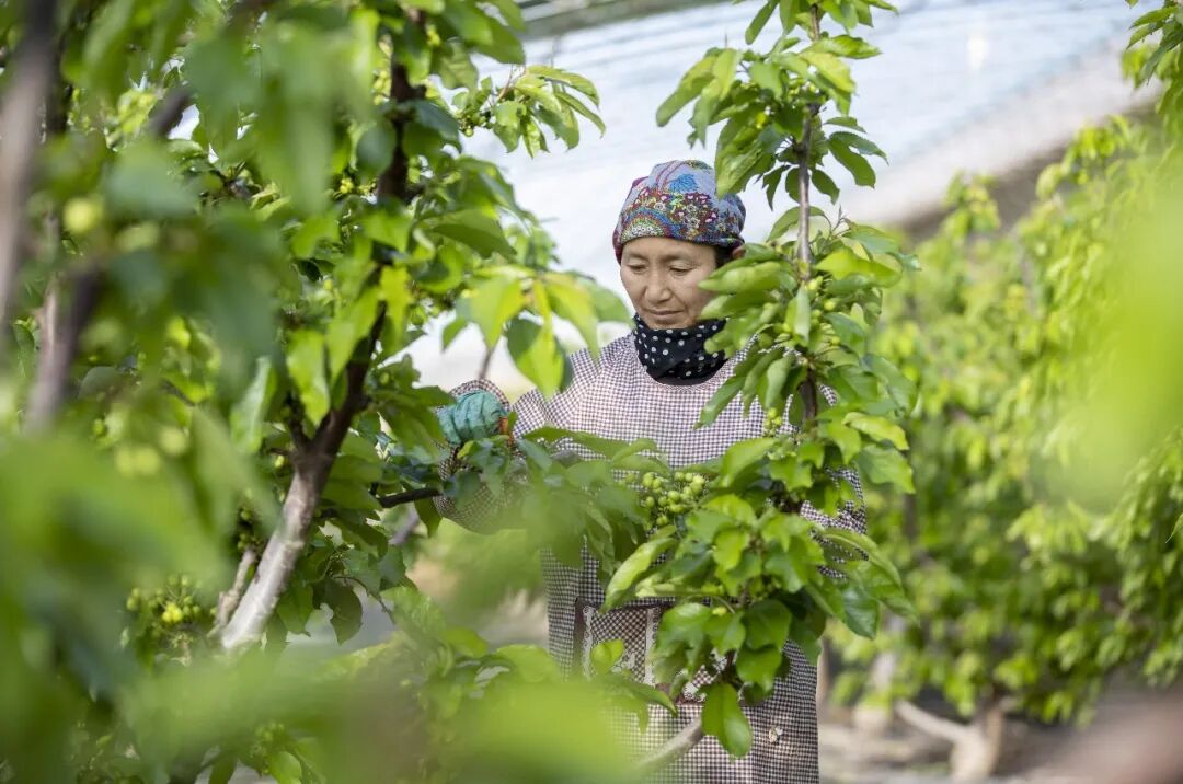 近年来,宁夏银川市贺兰县习岗镇大力发展设施农业,带动3000多名农民增收致富。图为农民在新平村设施园区樱桃温棚内劳作。新华社记者 杨植森摄