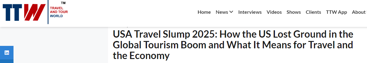 国际旅游行业媒体《旅行与旅游世界》网站也在报道中提到,美国旅游业2025年呈现出了与全球旅游业蓬勃发展截然相反的态势——入境游客数量减少、旅游消费额下滑,这一局面给美国旅游行业乃至整体经济带来巨大冲击。