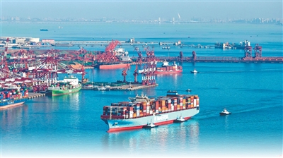 2025年12月26日,山东港口青岛港前湾集装箱码头巨轮穿梭、吊臂起落,一派繁忙景象。