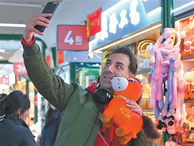 1月12日,在浙江义乌市国际商贸城一区玩具销售区,芬兰外商与“哭哭马”小马公仔玩具合影。