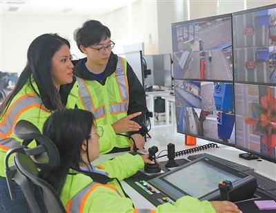 2025年10月7日,在秘鲁钱凯港,中远海运港口秘鲁钱凯公司中外员工进行作业监控。