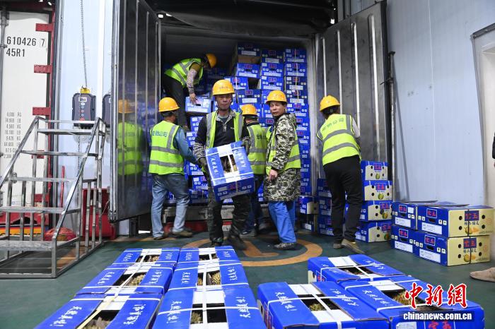 图为工人将刚入境的榴莲搬下车,准备接受海关查验。中新网记者 蒋雪林 摄