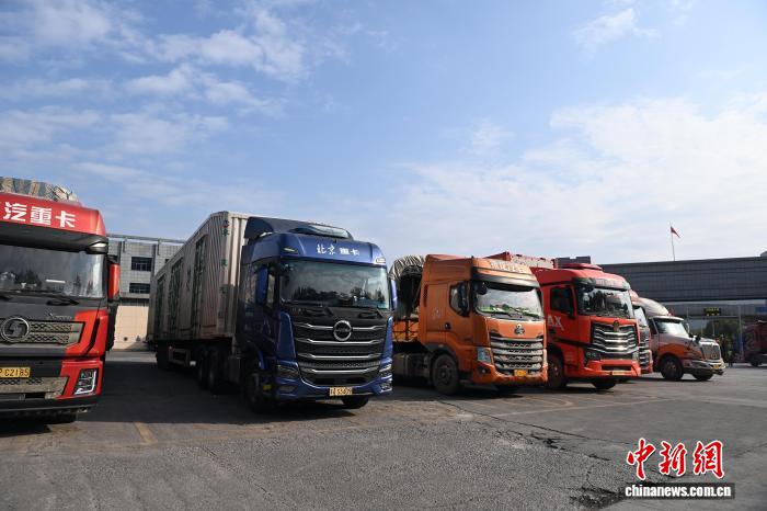 图为多辆货车在广西爱店口岸等候通关。中新网记者 蒋雪林 摄