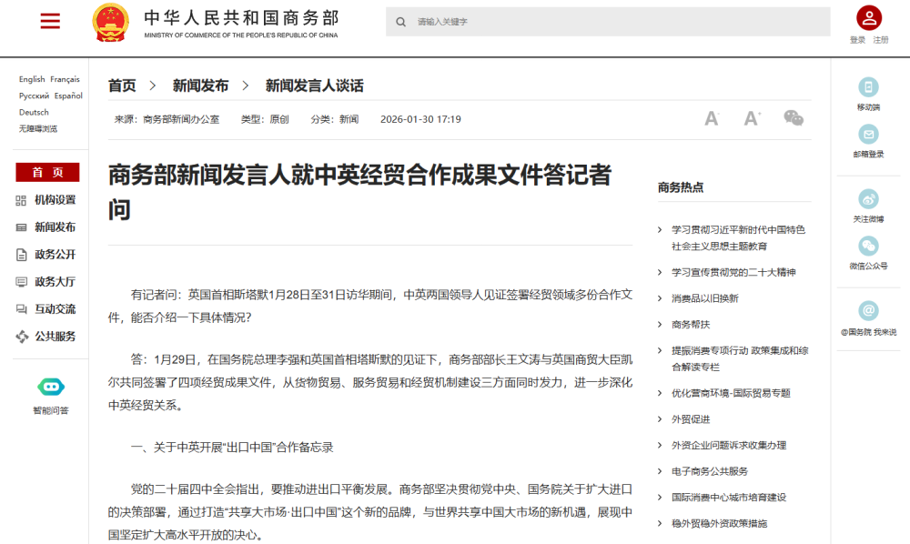 中国网1月30日讯 据商务部网站消息,商务部新闻发言人就中英经贸合作成果文件答记者问。