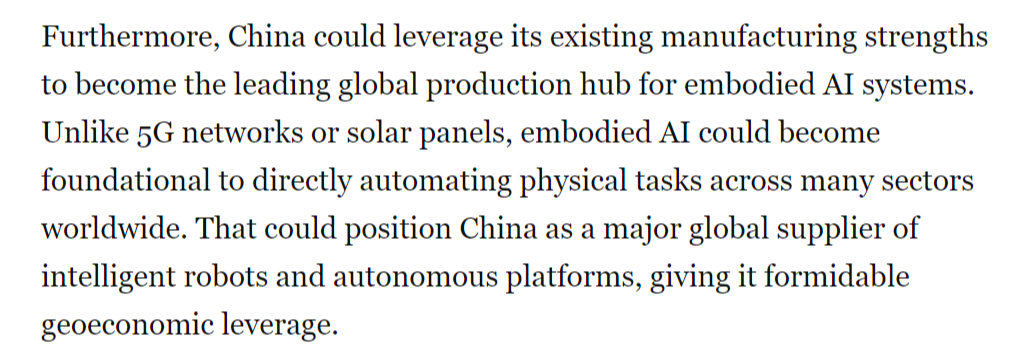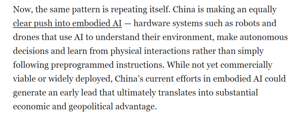 文章还认为,中国可凭借现有的制造优势,成为全球具身人工智能系统的主要生产中心。与5G网络或太阳能电池板不同,具身人工智能可能成为在全球多个行业将物理任务直接自动化的基础。这将使中国成为智能机器人和自主平台的主要全球供应国,从而为其带来强大的地缘经济影响力。