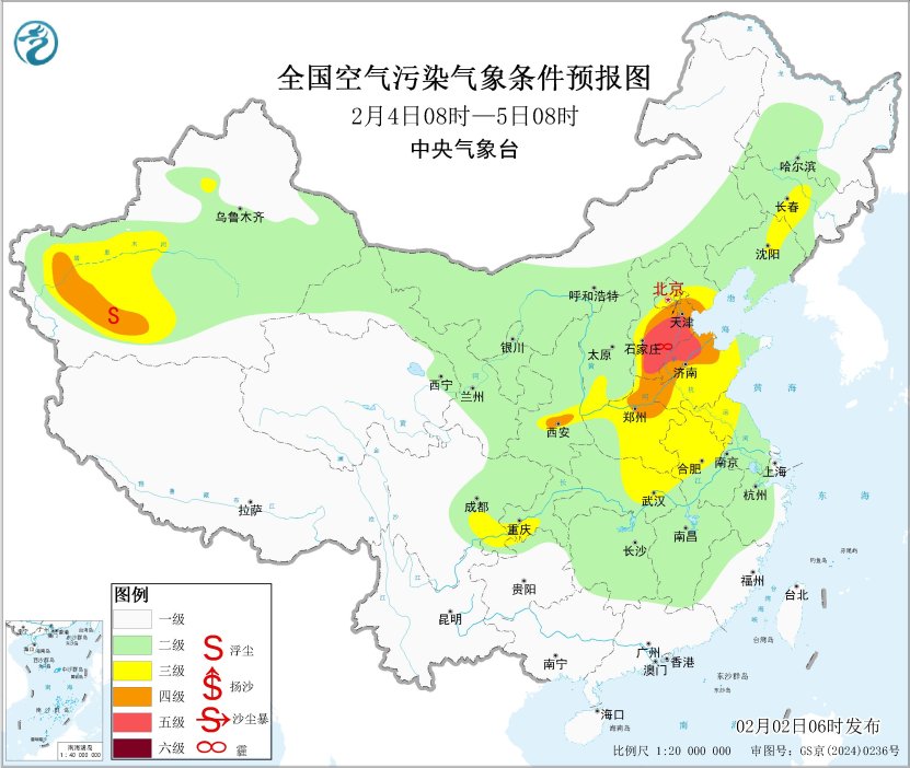 2日至4日,区域中南部有轻至中度霾,局地重度霾。5日起,受冷空气影响,上述地区霾天气自北向南逐渐减弱消散。