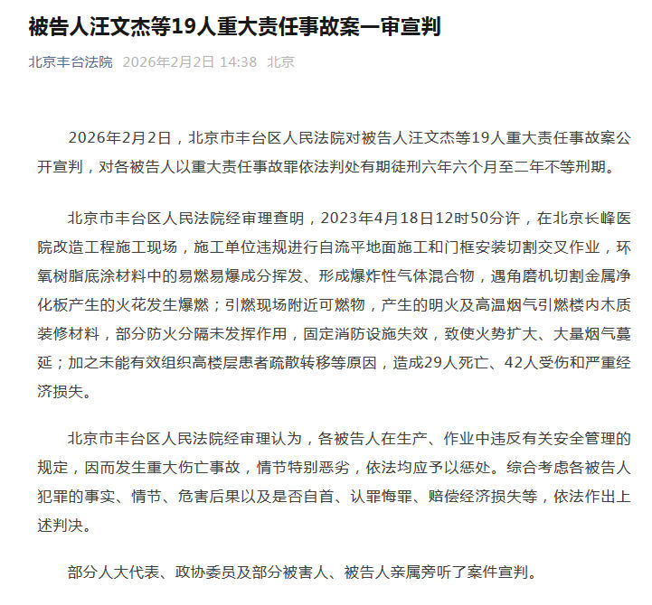中国网2月2日讯 据北京丰台法院微信公众号消息,2026年2月2日,北京市丰台区人民法院对被告人汪文杰等19人重大责任事故案公开宣判,对各被告人以重大责任事故罪依法判处有期徒刑六年六个月至二年不等刑期。