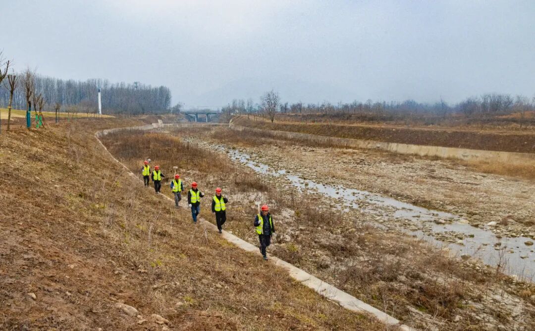 2026年1月31日,秦岭北麓主体山水林田湖草沙一体化保护和修复工程项目的工人行走在小峪河边。摄影 陈建/人民画报