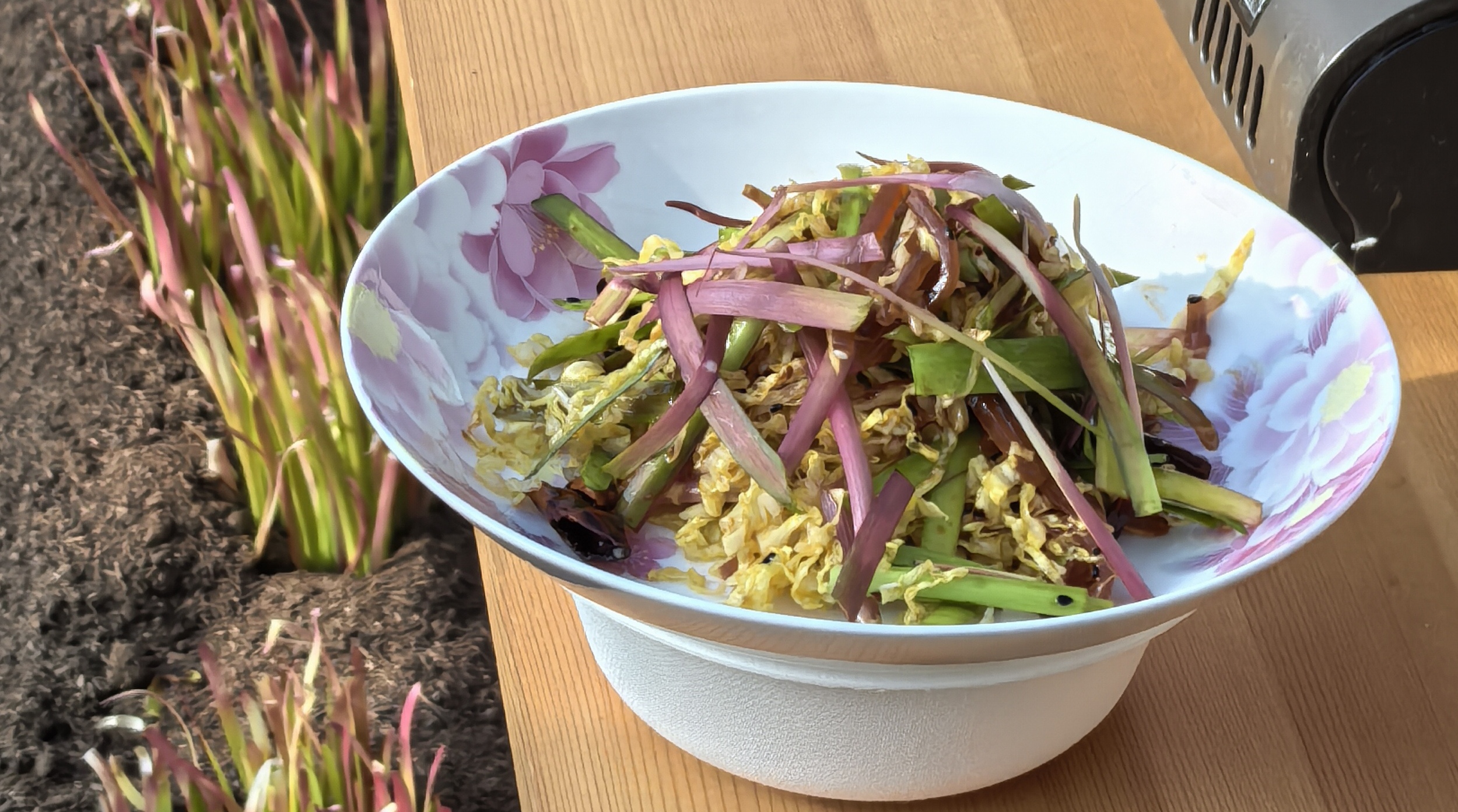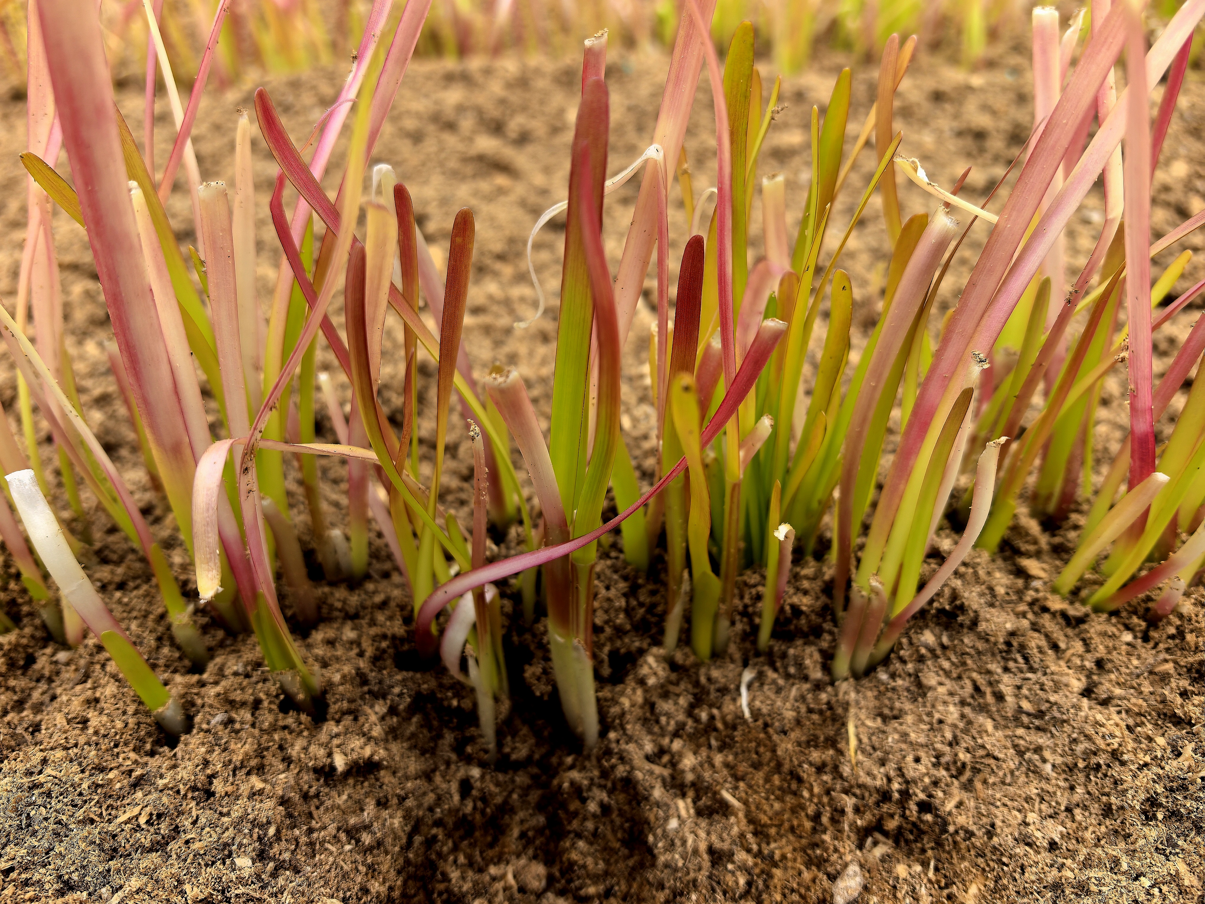 这样的颜色并非品种天生,而是产于一套复杂细致的栽培技艺。在冬季,用特殊的基质层层覆盖韭菜地,精细调控掀盖的时间、厚度来控制温度和光照条件,使其在不同植株部位呈现出丰富的色彩。