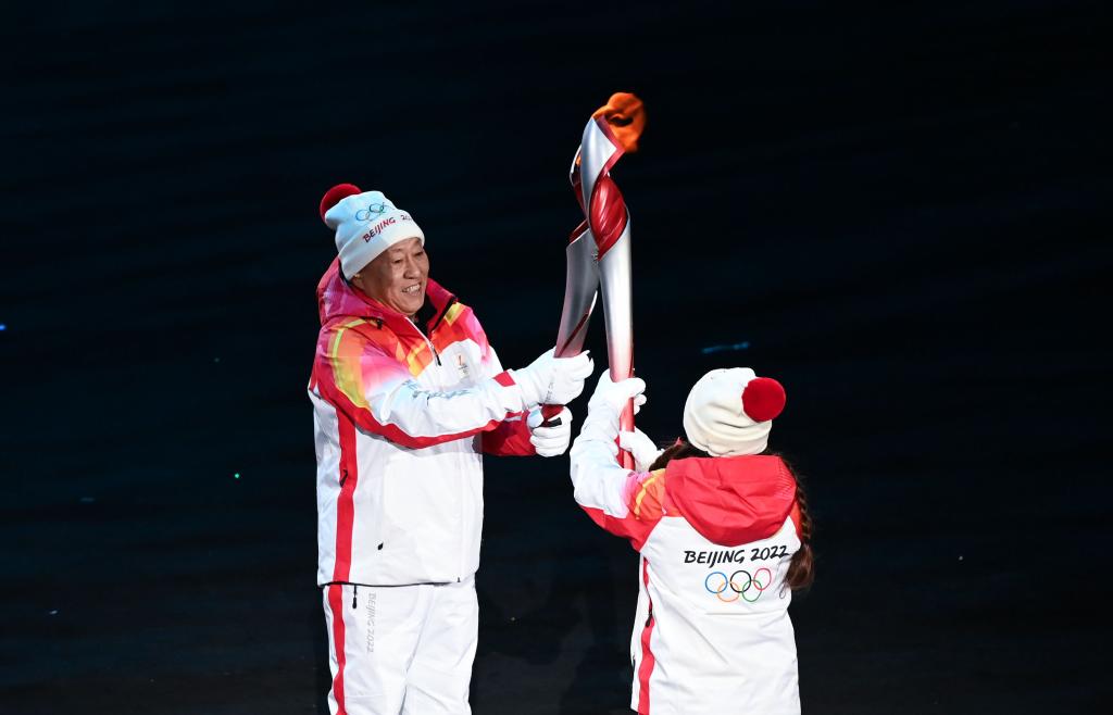 北京冬奥会开幕式上,赵伟昌(左)与李琰在开幕式上传递火炬。新华社记者 熊琦 摄
