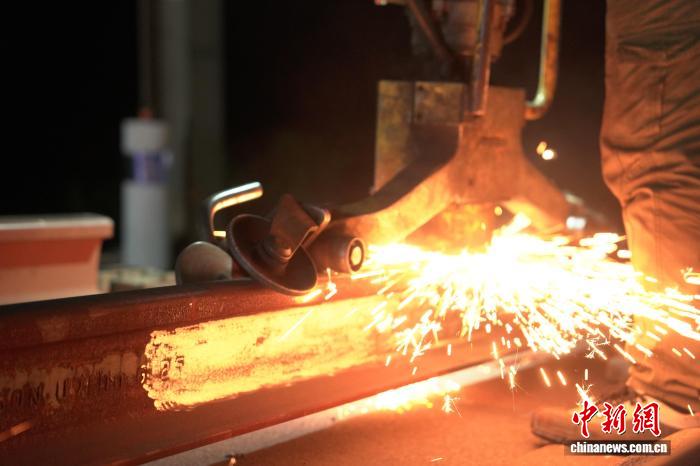 指令下达,数十名工友迅速行动,锯轨机、电动扳手齐上阵,清脆的金属碰撞声在夜色中接连响起。锯轨机的砂轮切触钢轨的瞬间,灼烧的金属碎屑骤然迸溅,如漫天星火洒落地面,化作绚烂的“打铁花”。与此同时,锯轨机两侧的工友握紧扳手,对准扣件精准拧动,500多根螺栓,不到10分钟便被全部拧出。