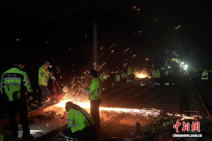 2月1日,国铁广州局广州南高铁工务段重点维修车间的工友正集结在京广高铁广州北至清远区段开展换轨作业。王玮 摄