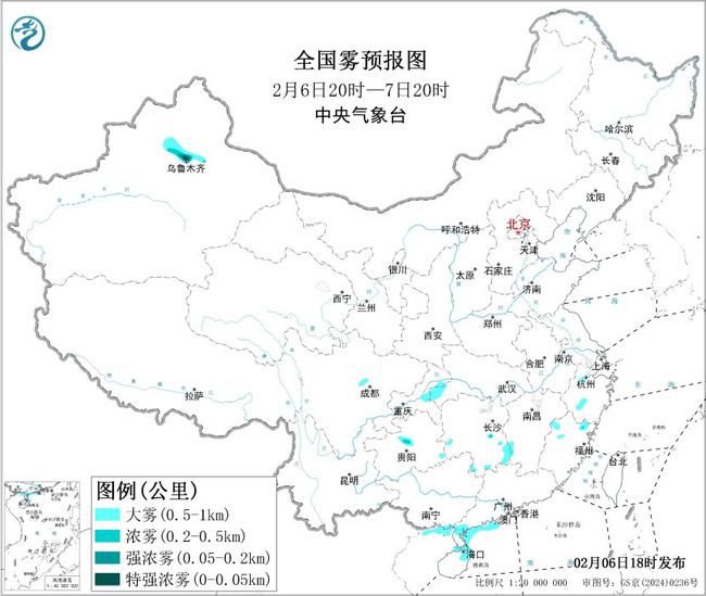 预计,2月6日夜间至7日白天,北部湾北部沿岸海域、琼州海峡、粤西沿岸海域将有能见度不足1公里的大雾。另外,夜间至上午时段,新疆北部、湖北西南部、贵州中部、湖南南部等地的部分地区有大雾,其中新疆北部局地有能见度不足200米的强浓雾。