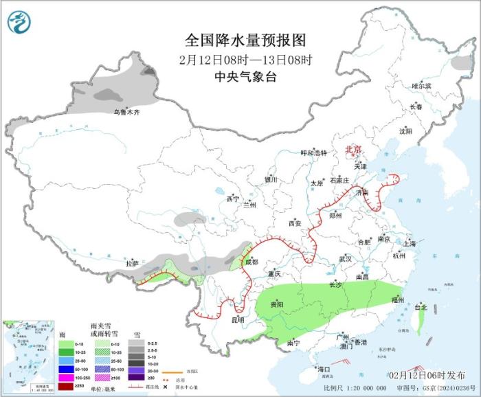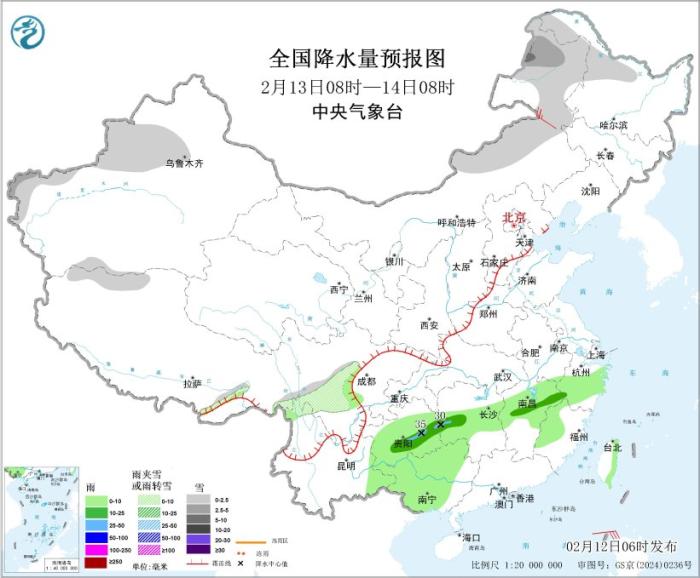图1 全国降水量预报图(2月12日08时-13日08时)