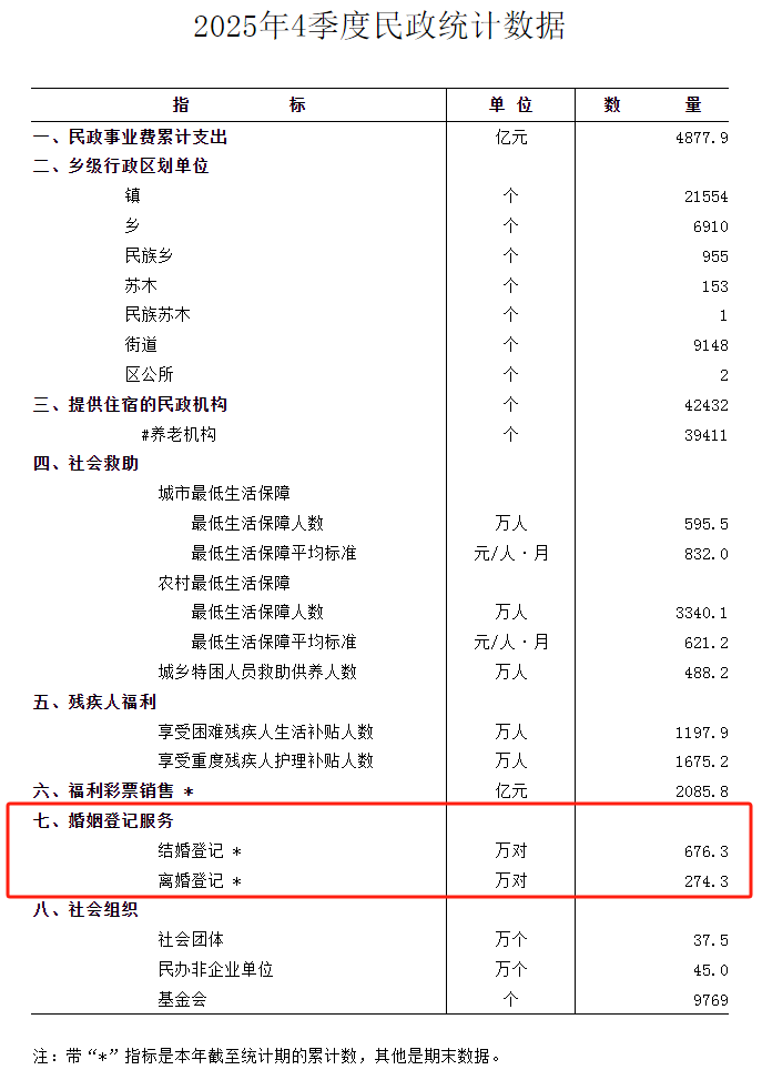 中国网2月12日讯 民政部11日公布的2025年四季度民政统计数据显示,2025年结婚登记676.3万对,较2024年增加65.7万对;离婚登记274.3万对。