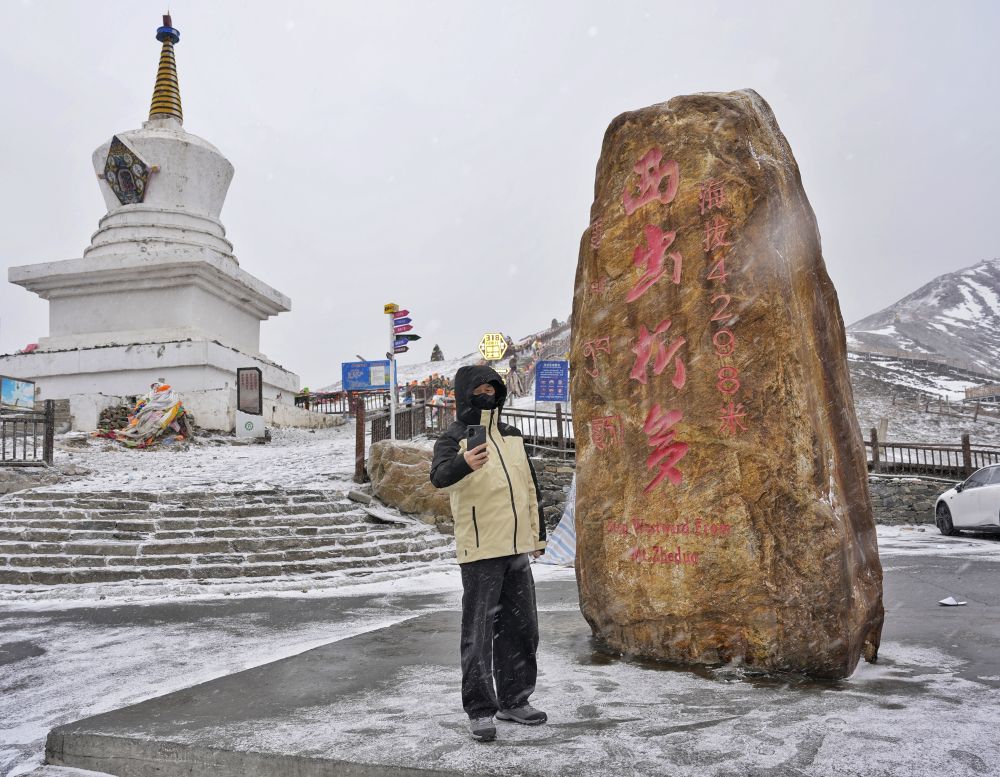 记者一行翻越折多山时,恰逢风雪交加夜。