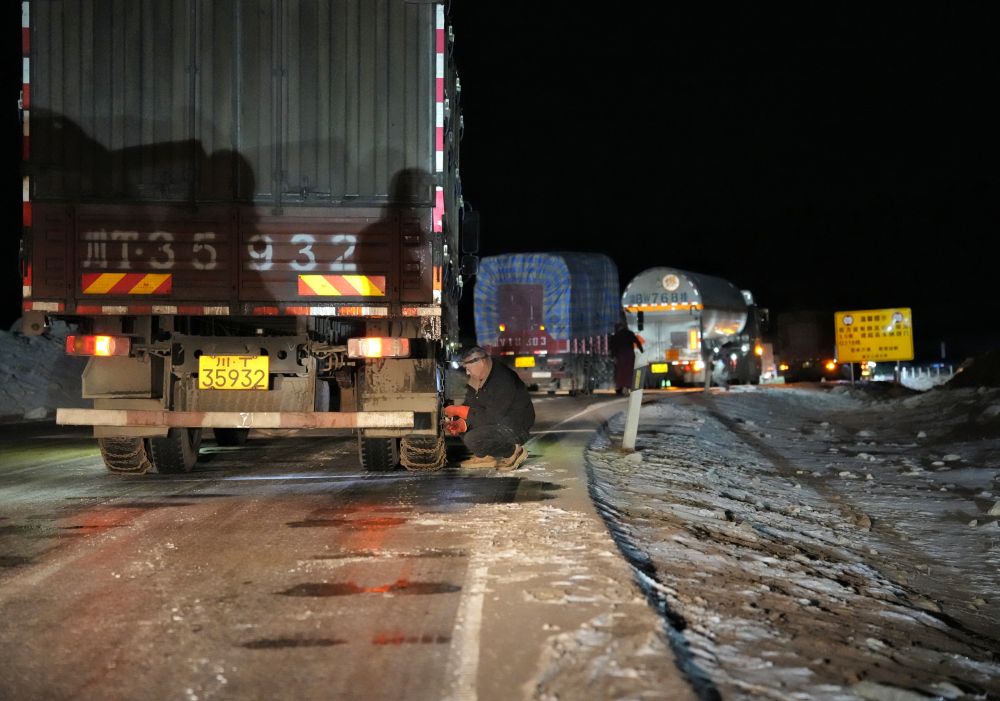 1月30日晚,折多山雪夜中,司机们纷纷停车安装防滑链。新华社记者刘坤 摄