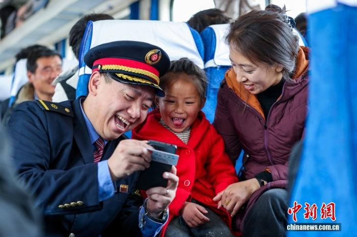 春运期间,拉萨至广州白云的列车上,列车工作人员与小朋友互动,享受旅途的喜悦。中新社记者 薛蒂 摄
