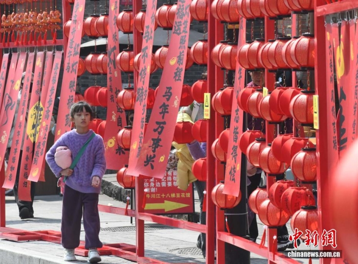 2月13日,小朋友从马年新春装置旁走过。丙午马年春节将至,重庆十八梯传统风貌区的大红灯笼和马年新春装置,营造出浓厚的节日喜庆氛围。中新社记者 周毅 摄