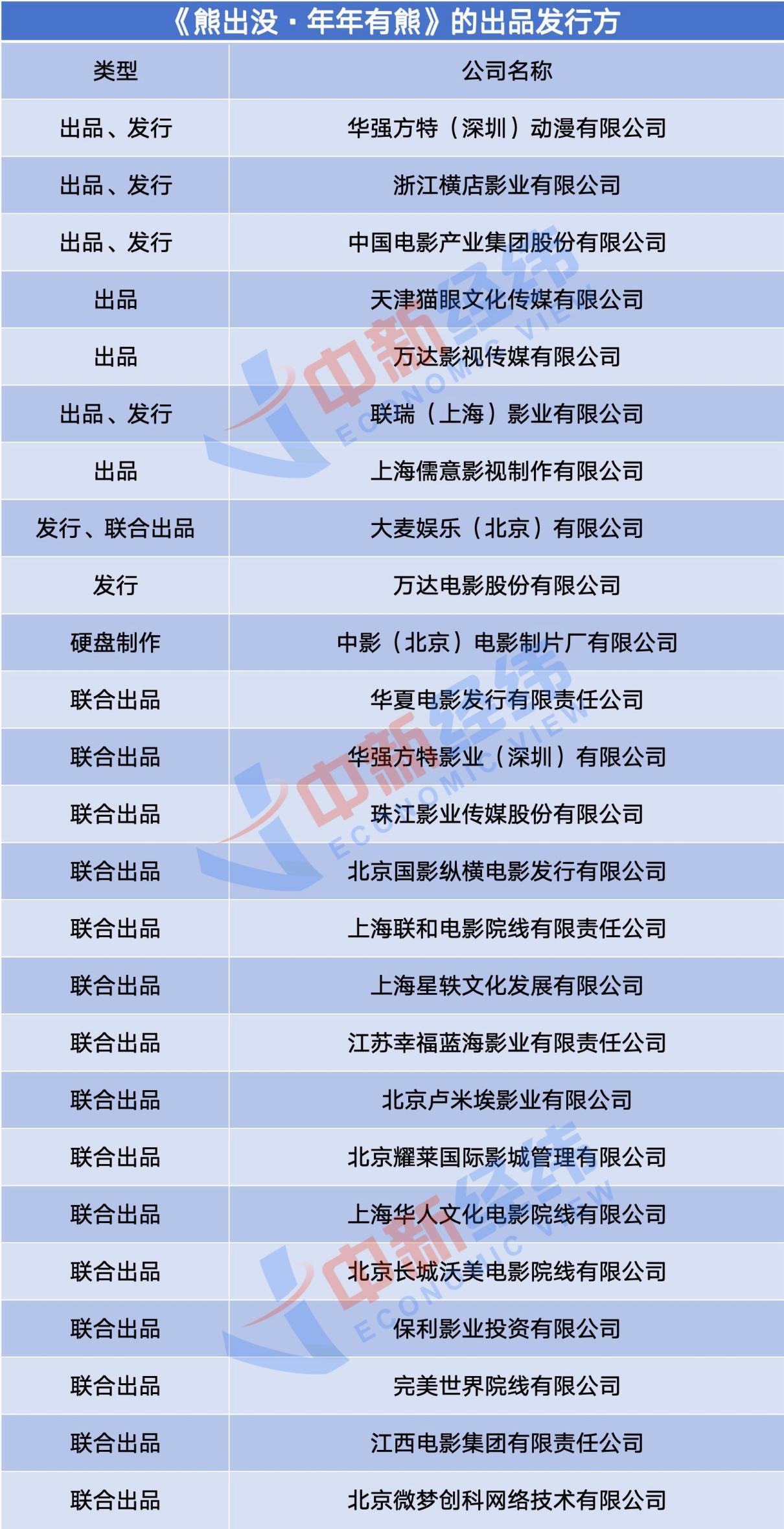 《熊出没·年年有熊》是第12部《熊出没》电影,该电影共有7家出品公司、6家发行公司、16家联合出品公司,除华强方特外,还能看到中国电影、横店影视、万达电影、幸福蓝海等上市公司的身影。