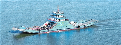 安徽省铜陵市,搭载乘客和车辆的轮渡前往位于长江江心洲的义安区老洲乡。