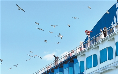 山东省烟台市,乘船前往大连的旅客在甲板上喂海鸥。