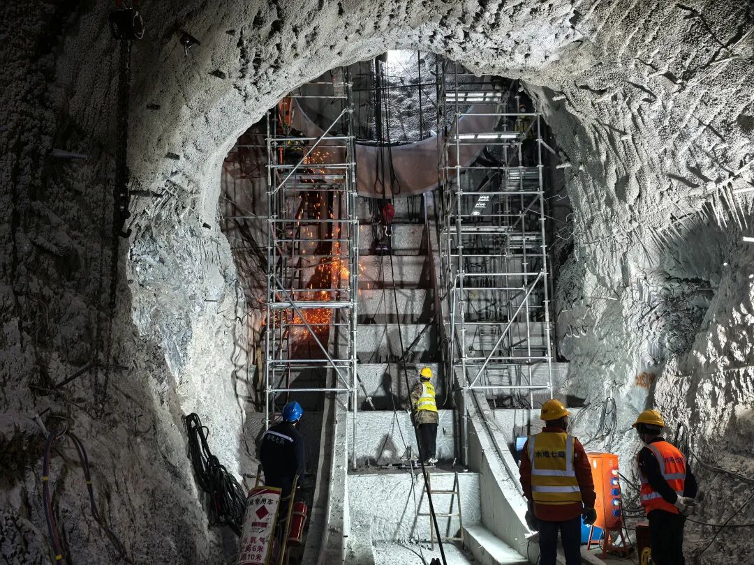 引水隧洞是电站的“生命线”。在水电四局承建的引水隧洞内,10余名工人正手持工具清理基岩面的松散碎石,指甲缝里嵌满的泥垢早已分不清是混凝土还是岩屑。“这里地质复杂,围岩破碎且渗水量大,机械作业容易引发坍塌,只能靠人工清理。”质检员张杰一边记录质检数据,一边向记者介绍。