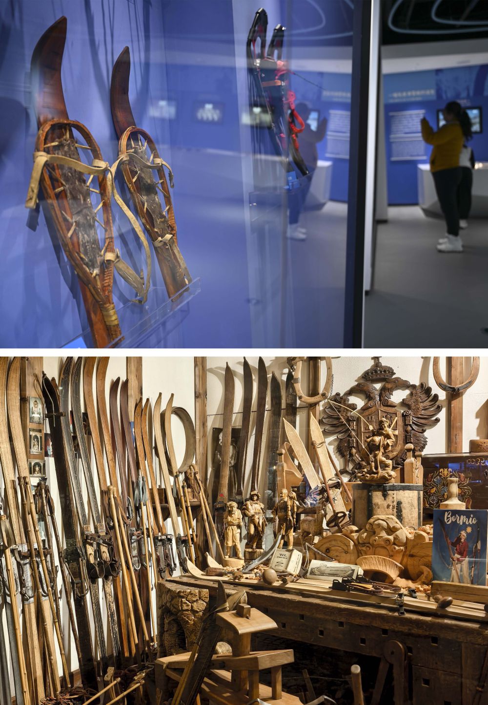 拼版照片:上图为游客在中国新疆阿勒泰人类滑雪起源地博物馆参观(2025年1月24日摄)。下图为在意大利博尔米奥拍摄的一家展示老式滑雪板的门店(2026年2月5日摄)。均为新华社记者 胡虎虎 摄