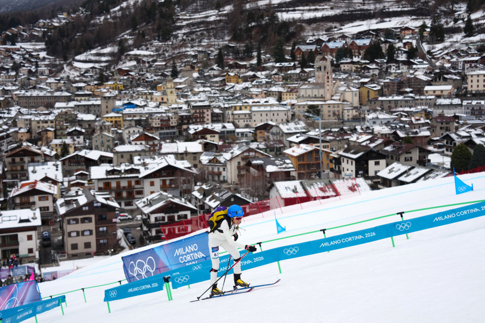 2026年2月21日,次旦玉珍在米兰-科尔蒂纳冬奥会滑雪登山混合接力的比赛中。新华社记者 颜麟蕴 摄