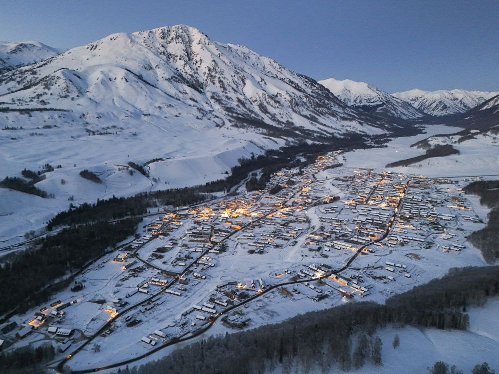 夜幕降临,新疆阿勒泰将军山国际滑雪度假区即将开启夜场运营(2025年1月24日摄,无人机照片)。新华社记者 胡虎虎 摄