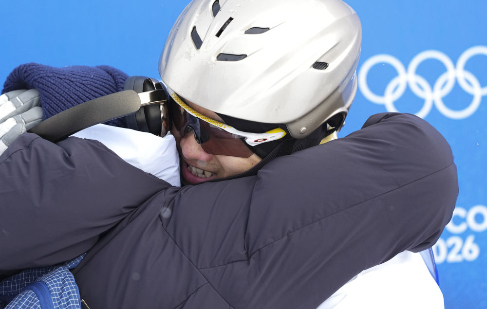 2月20日,王心迪(右)和妻子徐梦桃在比赛中拥抱。当地时间2月20日,在意大利利维尼奥举行的米兰-科尔蒂纳冬奥会自由式滑雪男子空中技巧决赛中,中国选手王心迪和李天马分获冠军和季军。新华社记者 邬惠我 摄
