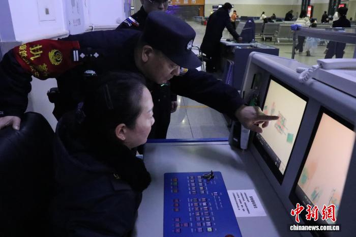 民警裴保军督导客运职工对旅客携带可疑物品进行检查。许晶 摄