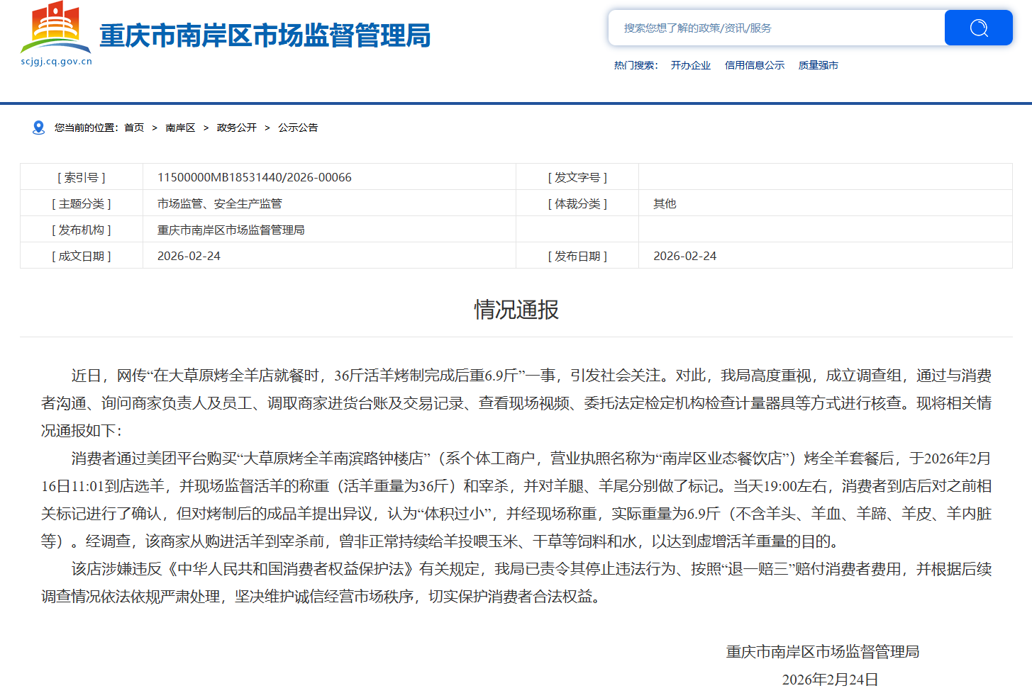 中国网2月24日讯 重庆市南岸区市场监督管理局24日就当地“36斤活羊烤制完成后重6.9斤”一事发布情况通报。内容如下:
