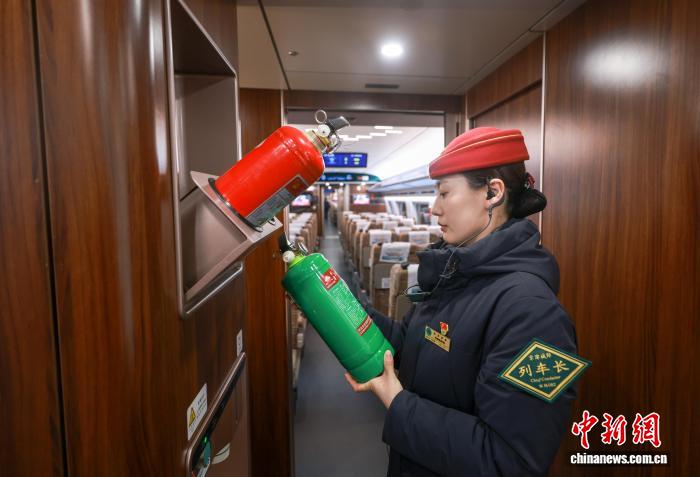 京津城际列车长在发车前检查车内灭火器状态。记者 贾天勇 摄