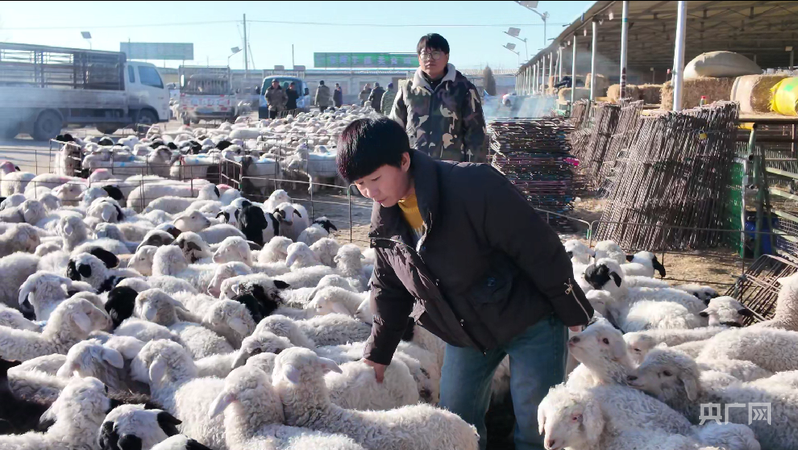蒲万林在古浪县牛羊交易市场挑选羊羔(央广网记者 寇刚 摄)