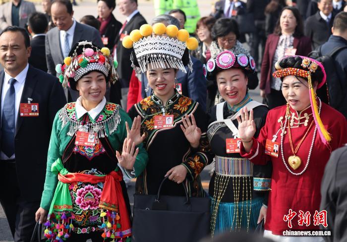 2025年3月8日,十四届全国人大三次会议在北京人民大会堂举行第二次全体会议,会后全国人大代表金瑞瑞(左二)走出会场。 中新社记者 杨可佳 摄