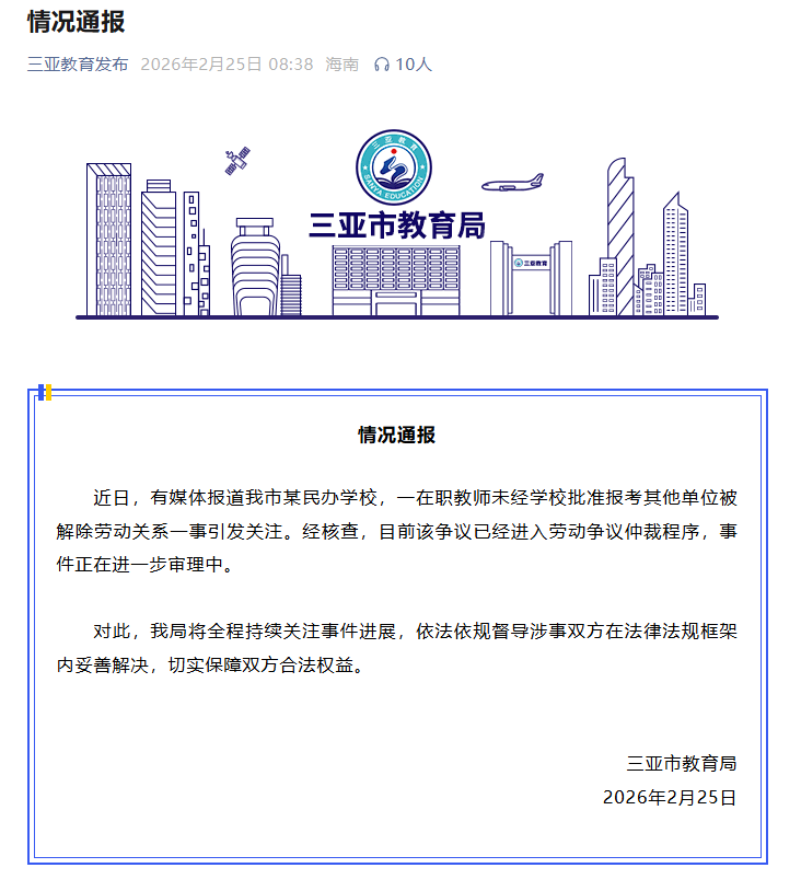 三亚通报“在职教师报考其他单位被开除”:已进入劳动争议仲裁程序