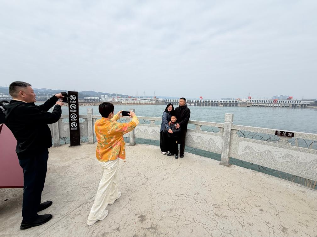 2月17日,游客在葛洲坝下游泄洪闸前的观景台合影。新华社记者陆睿 摄