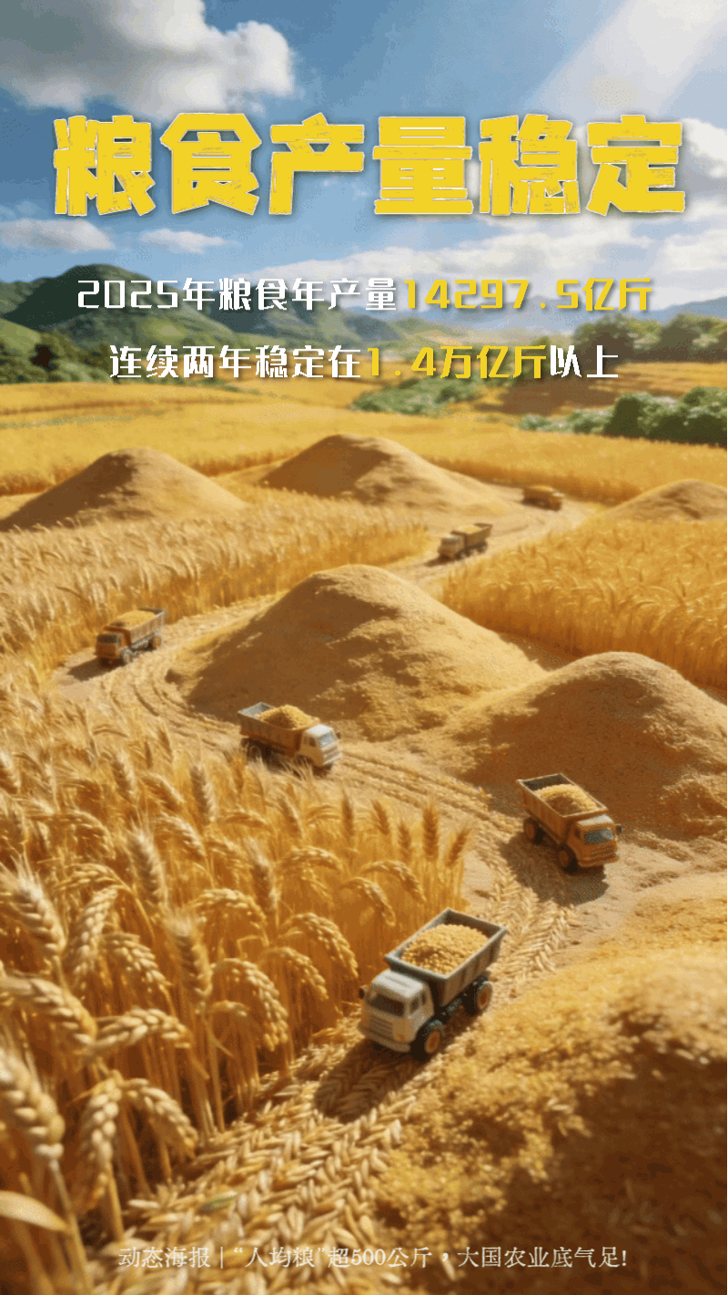 编者按:“十四五”期间,我国粮食年产量由13657亿斤增至14297.5亿斤,人均粮食占有量由483公斤增至500多公斤。手中有粮,心中不慌。一组动态海报了解我国“粮食家底”!