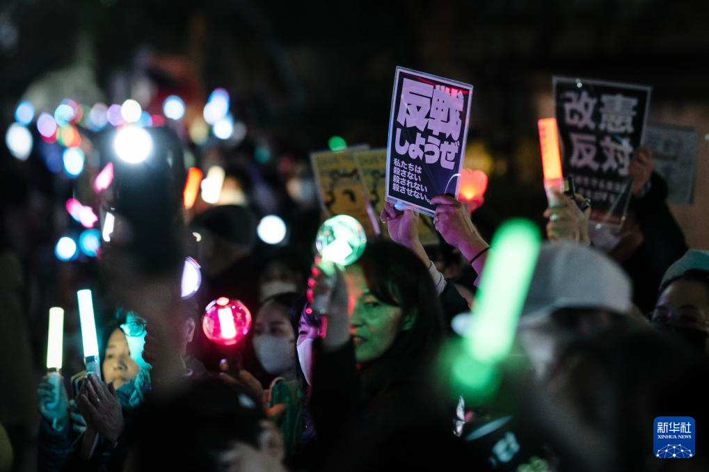 当晚的集会有近千人参加。抗议者手举写有“反对战争,维护宪法”“不要战争 不要高市”“不能容忍高市政治”等字样的牌子,高呼“反对修宪”“守护和平”等口号,对高市企图修宪表达不满。