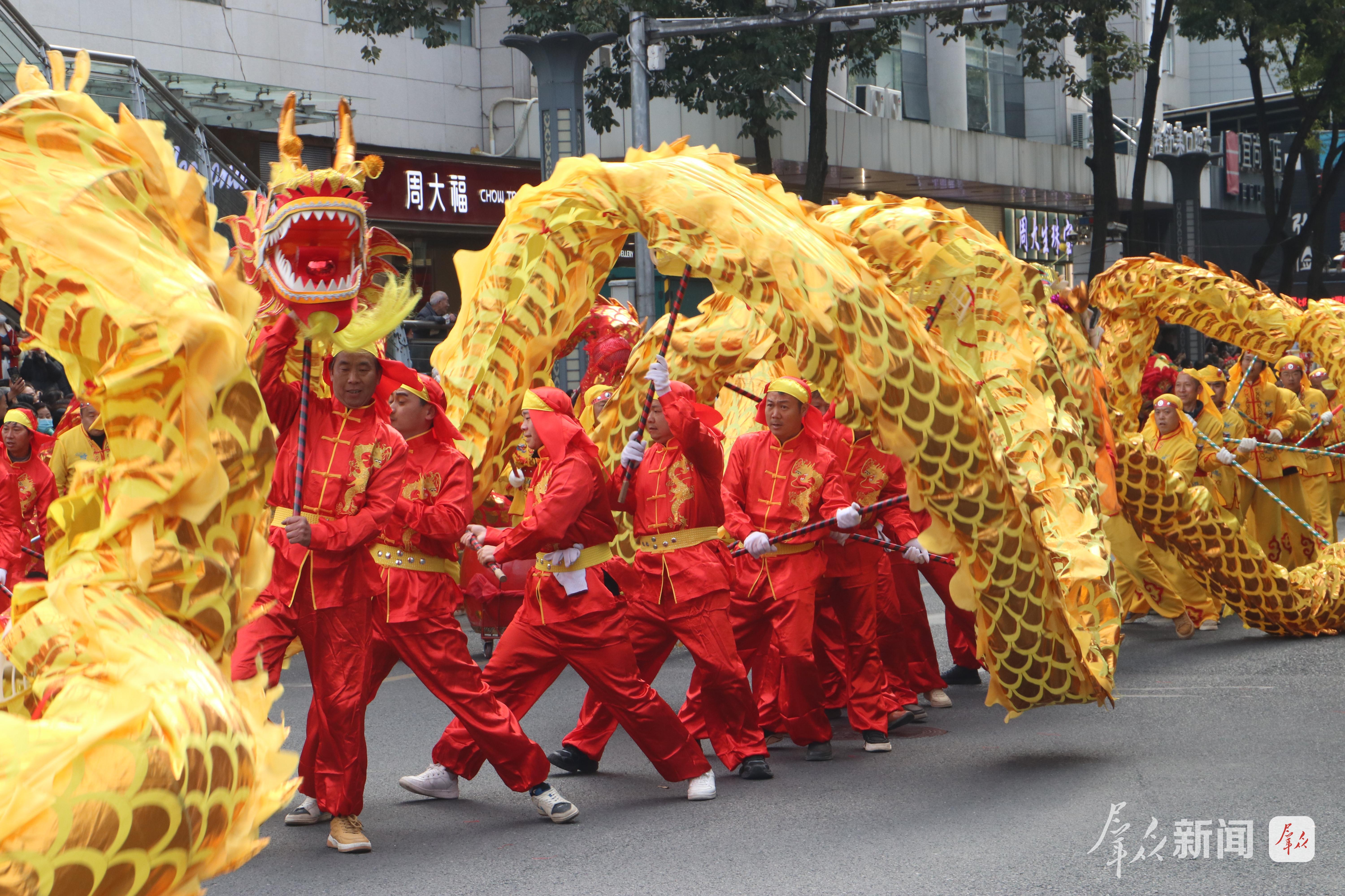 2月27日,演员在社火巡游中进行舞龙表演。
